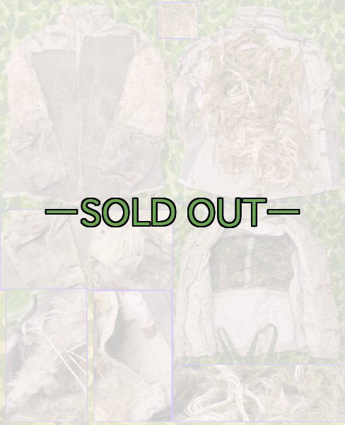 M65フィールドジャケットで作られたギリージャケットです。程度は中古でラベルが取られているのでサイズは不明ですが、M-レギュラーぐらいです。両袖口には胸ポケットが縫い付けられています。(この改造は最近のギリースーツによく見受けられます。)また、後ろの裾部分にマップポケットのようなものもあります。すすけたように見える部分はスプレーの色です。偽装効果を高める為にスプレーされたようです。このタイプは初めての入荷です。中々、雰囲気あります。画像の1点のみです。オススメ!