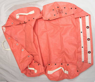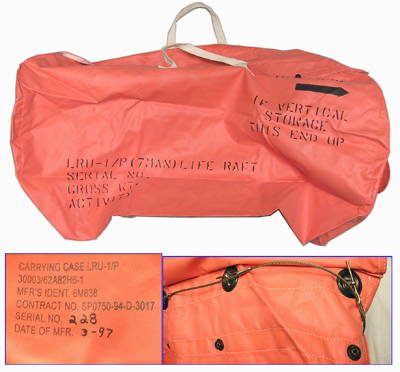 LRU-1/Pライフラフトを収納するバッグです。程度は保管時の若干のヨゴレ等がありますが、未使用品です。形状は円柱状で直径約43センチ、長さ約93センチぐらいです。素材は厚手のビニールのような感じです。丈夫な感じです。前後はドットボタンで上部は画像右下の通り、ハトメにピンを通すようになっています。サイドに収納しているワイヤー付のハンドルを引っ張ることにより素早く開くことが出来ます。開いた状態はこんな感じです。アイディア次第で色々、使えそうです。