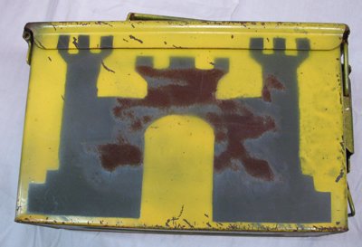 アーモBOXのM型です。大きさは約15×18×30センチ。重量は約2.4キロです。画像の通り、米軍の部隊マーク?とフタに穴が4つ空けられています。灰皿にでも使っていたのかな?アーモBOX自体の程度は画像の通りかなり中古です。アジはあるね。画像の1点のみです。