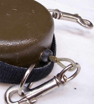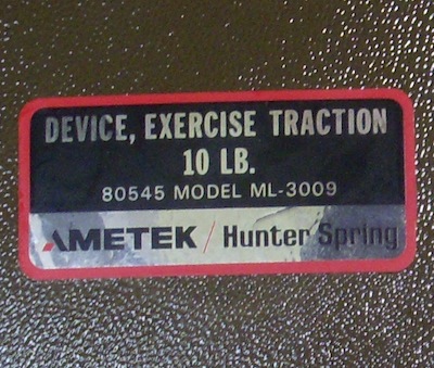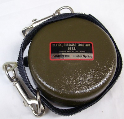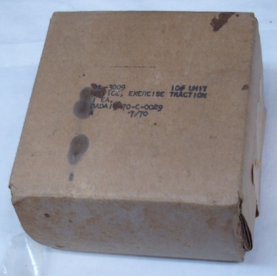 EXERCISE TRACTION DEVICEです。外観の大きさ直径10cm程です。そこそこ重量あります。詳細不明ですが、中にスプリングで伸縮するワイヤー(伸ばすと150cm程)が収納されています。(巻き尺の原理)推測すると10LB(4.5kg)の負荷がかかり、エクササイズ用ですので、軍用犬用のエクササイズ出来るリードのようなものだと思われます。もしかしたら、兵士が狭い空間でもトレーニング出来る運動器具なのかもしれません。程度は箱入りの未使用品でしたが、撮影の為、開封しています。一部金具にサビがありますが、未使用品です。画像でもご確認下さいね。画像でも確認出来ますが、70年代のものです。余り見たことのないアイテムですので、コレクション用にどうぞ!