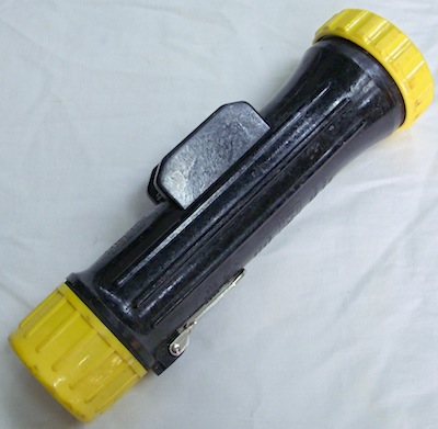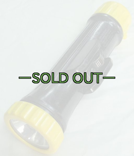 米軍で使用されていたライトです。全長約20cmで単一電池2本使用します。作業時に使用されるタイプで、アメリカの防爆基準を満たしたタイプのようです。この黒×イエローの組み合わせのライトは稀にしかありません。こちらのタイプはフック等にかけられるように可動式のリング付です。今回のタイプは70〜80年代頃のものだと思われます。