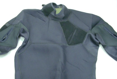 米軍放出のウェットスーツです。ショートタイプになります。程度は保管時の若干のヨゴレ、テープ跡がありますが、新品同様です。左胸と両腕にはベロクロスペース、両腕にはジッパー付きのポケット、背中のジッパーを開閉して、履き脱ぎします。アメリカのALEEDA WETSUITS社製で、XLサイズの表示がありますが、ウェットスーツなので結構、伸縮性がありますが、参考までに平置きで伸ばさない状態で測った各所のサイズは