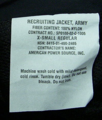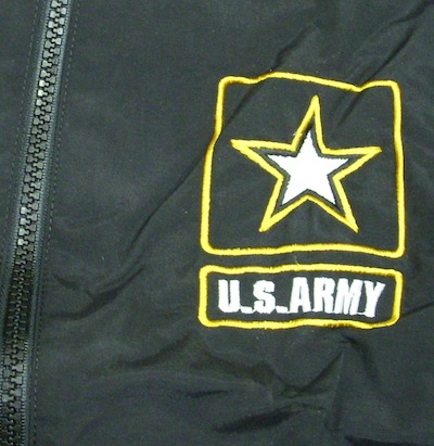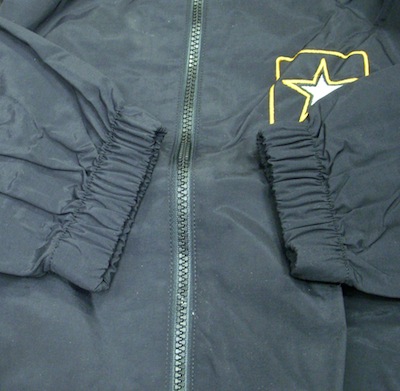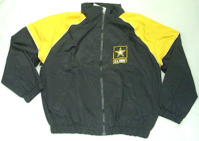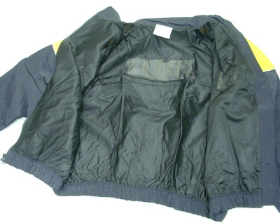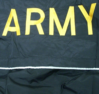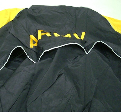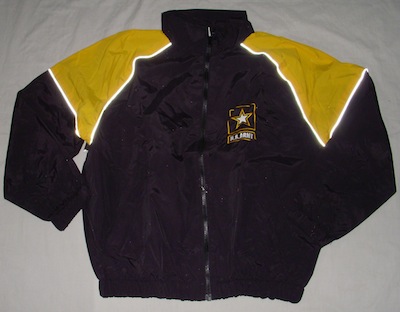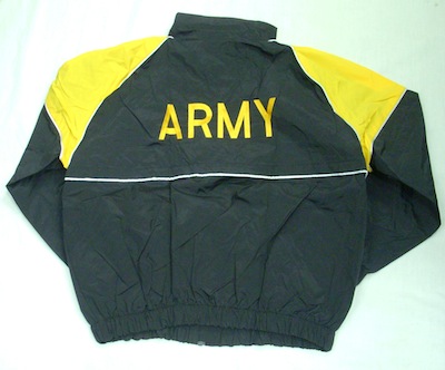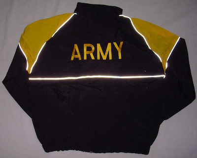 ARMYのリクルーター用のPTジャケットだと思われます。リクルーティングの表示があるので、ARMYの新兵用か、教職員用のジャケットなのかもしれません。色は黒とイエローです。程度は保管時の軽いヨゴレ等がある場合がありますが、未使用品です。外観は溌水性があるような感じのナイロン製です。左胸のARMYマークと文字やバックの文字は刺繍です。で表や裏の白いラインの部分はリフレクターになっていて反射します。裏地はメッシュ素材で、腰の両サイドもジッパーが付いていてトレーニング時にポケット内部のものが落ちないようになっています。参考までに各サイズの各所のサイズは