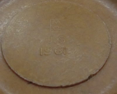 米軍基地内で使用されていた軍用のメラミン樹脂製のマグカップです。1961年製です。口の直径約8.5cm、高さ約8.5cm程です。程度は中古でそれなりに使用感があります。(容量的には200〜250ccぐらいかな。)70〜80年代の同型のものと比べると色が濃いです。50年代のものだとさらに色が濃いです。また、スタッキングも可能です。