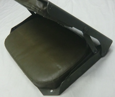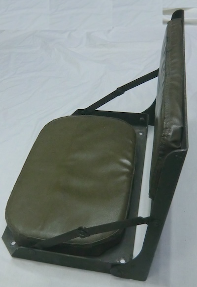 詳細不明ですが、軍用車両の補助座席シートのようです。座面と背面の金属板はジュラルミン(アルミ)で蝶番とネジは鉄です。頑丈な感じです。