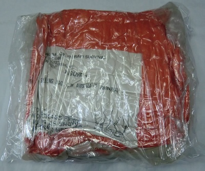 米軍放出の航空機用サバイバルスリーピングバッグです。1枚目画像の真空パック状態で大きさは約34×5×34cmで、重量2.3kgです。90年代頃のもので、色はレスキューオレンジ、コールドウェザーの表示があるので、冬季用寝袋という感じでしょうか。真空パック状態ですので、開封していませんが、特に不具合はなさそうです。形状はマミースタイルの1人用だと思われます。
