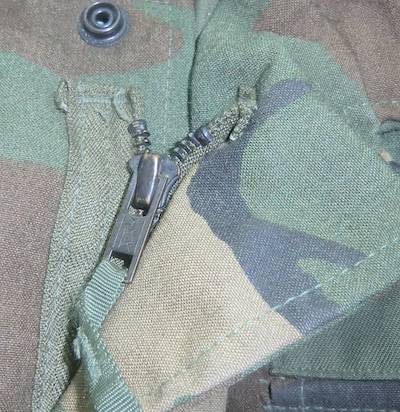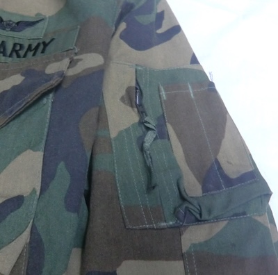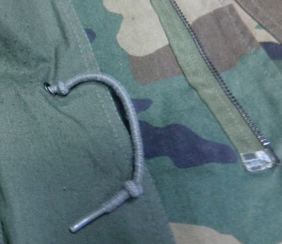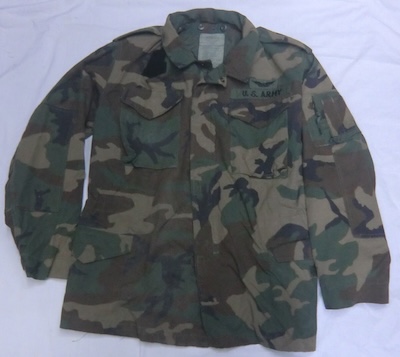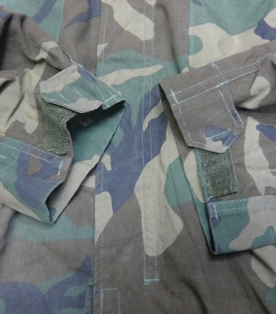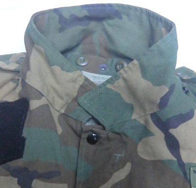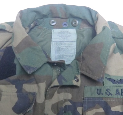 ウッドランド柄のエアクルージャケットです。薄手のシャツではありません。90年代頃のもので、M65フィールドジャケット程ではありませんが、裏地の付いた若干厚手のジャケットです。素材はノーメックス(アラミド)です。フロントはジッパーで他はベロクロ留めです。エリ部にドットが3個、内側にはボタンが付いていますので、専用のフードとライナーがあるようです。こちらでは見ることがないタイプですので、寒い地域で短期間使用されていたタイプなのかもしれません。程度は中古でそれなりに使用感がありますが、中古良品です。