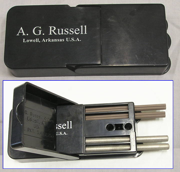 米軍放出のA.G.Russellのシャープナーです。刃物を研ぐのに使用します。程度は中古ですが、ほとんど、使用されていないみたいです。ケースの外観の大きさは約13×2×5.5センチぐらいです。画像の1点のみです。