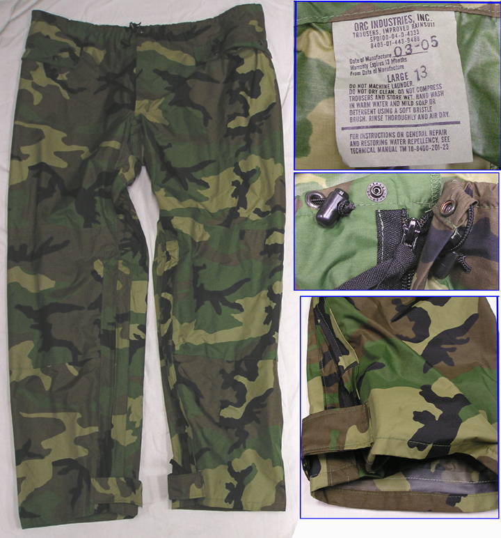 新型のレインパンツです。形状、素材感ともに米軍のゴアテックスパンツとにています。素材はナイロンにラバーコーティングしたような感じの素材です。ゴアテックスではありません。程度は中古ですが、割とキレイです。中古上ぐらいです。サイズはLサイズです。参考までに各所のサイズは