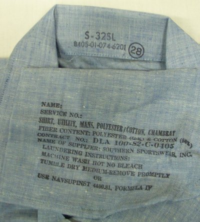旧型のNAVY用の長袖シャツです。シャンプレーシャツとも呼ばれています。素材はコットン&ポリエステルで、80〜90年代頃のものになります。程度は未使用品です。参考までに各サイズの各所のサイズは