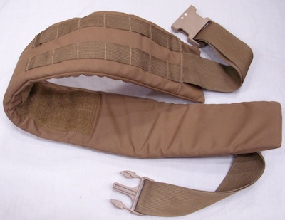 米軍放出のコヨーテ色ののナイロンベルトです。パッド入りで、MOLLE対応です。程度は中古良品です。MC用のパックパックのウエストベルトかもしれません。