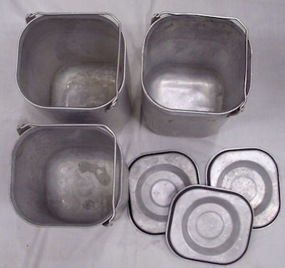 米軍のフードコンテナです。外観のサイズは50×24×40センチぐらいです。程度は中古でそれなりに使用感がありますが、中古良品です。フードコンテナ62年、3つのアルミケース65年のフルセットです。実用してもいいと思いますが、古いものですので、ディスプレーやコレクションにもどうぞ!画像の1セットのみです。カッコいいですよ!