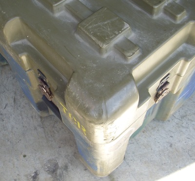 米軍放出のODのボックスです。ECS社製です。程度は中古で、それなりに使用感がありますが、中古良品です。素材は若干柔らかめのプラスティックのような素材で、気圧調整弁付です。外観の大きさは86×43×54cmぐらいです。中々、カッコよくて、いい感じの頑丈なボックスです。同型でしたら、ズレずに積み重ね可能です。両サイドに持ち手付で、フロントとバックに留め金が3つずつ、サイドに2個ずつです。