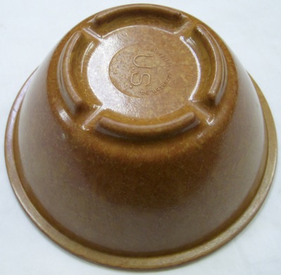 米軍基地内で使用されていた軍用のメラミン樹脂製のボウルです。60年代頃のもので製造年が入っていないタイプです。口の直径約14.5cm、高さ約6.5cm程です。(容量的には300〜350ccぐらいかな。)70〜80年代の同型のものと比べると色が濃いです。50年代のものだとさらに色が濃いです。